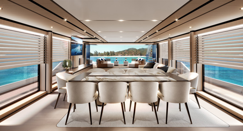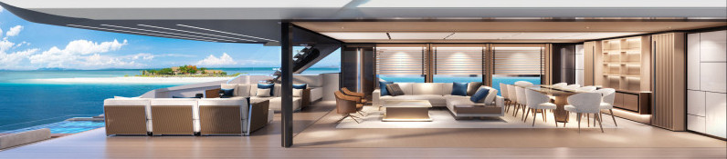 The DOM115 maintains the high level of customisation that characterises the entire range, offering countless options and solutions for both layout and interiors. The latter are a natural extension of the exteriors, and the expansive windows mean they are visible even when spending time outside, creating a seamless effect. The Owner enjoys unparalleled freedom, although the shipyard is always ready to help them make the final decision by proposing possible adjustments or alternative solutions. On this interior proposal by Stefano Vafiadis, the mood is warm and modern and the style sober, in a contemporary expression of timelessness. By drawing inspiration from great 20th-century architects, particularly those of Italian Rationalism, the designer has also aimed at capturing elements of Baglietto’s history. The sleek, pure lines further highlight the beauty and quality of the fine materials used on this vessel, and the neutral shades in the tones of beige, grey, and light blue reflect the most current fashion trends.