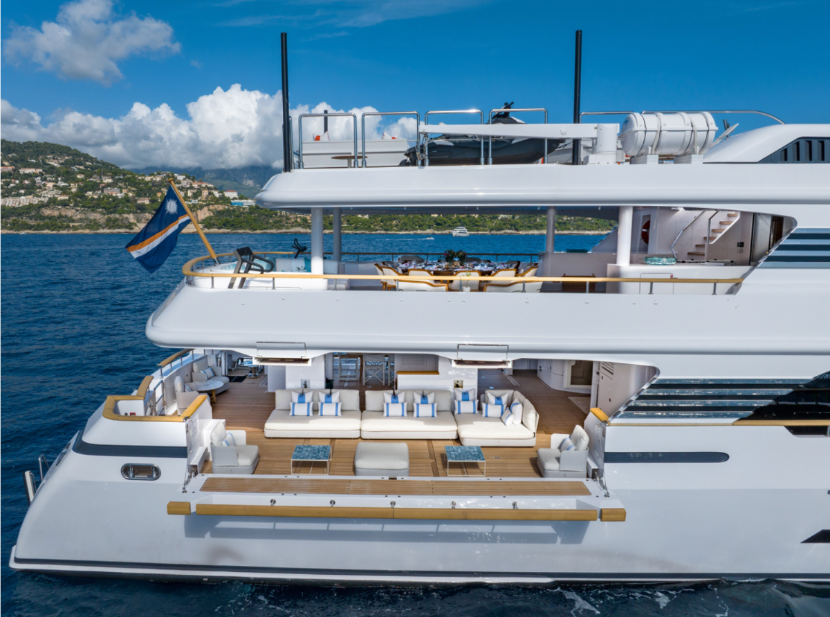 The aft open area was upgraded with new furniture and air conditioning. The same treatment was applied to the flybridge, where the aft furniture is now removable to accommodate a helicopter.
