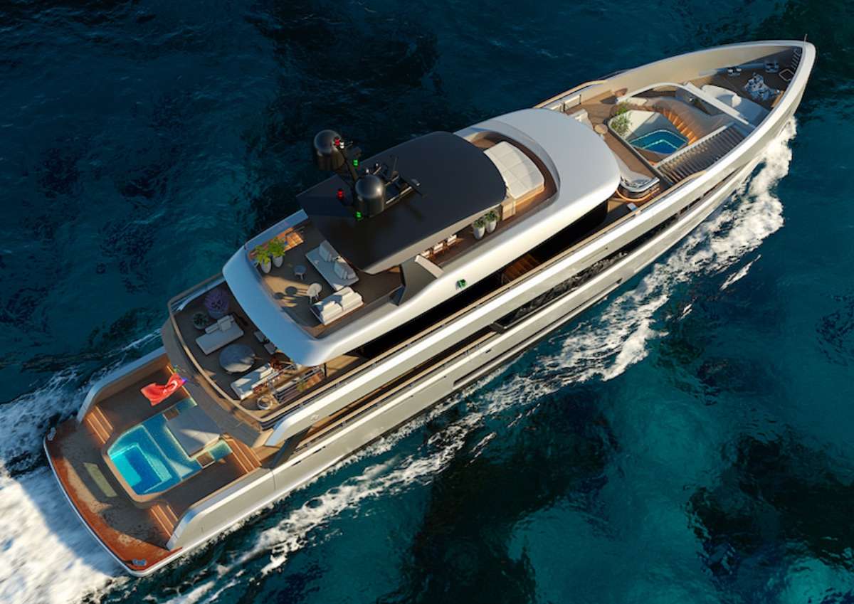 The vessel was designed by Luca Vallebona (exterior and interior layouts) and Hot Lab (interior design), part of The Viken Group, while Van Oossanen was responsible for the naval architecture. The Sirena 42M boasts open entertaining areas, spacious external relaxation zones, a distinctive master cabin with a private patio, and a vast beach club with drop-down bulwarks.