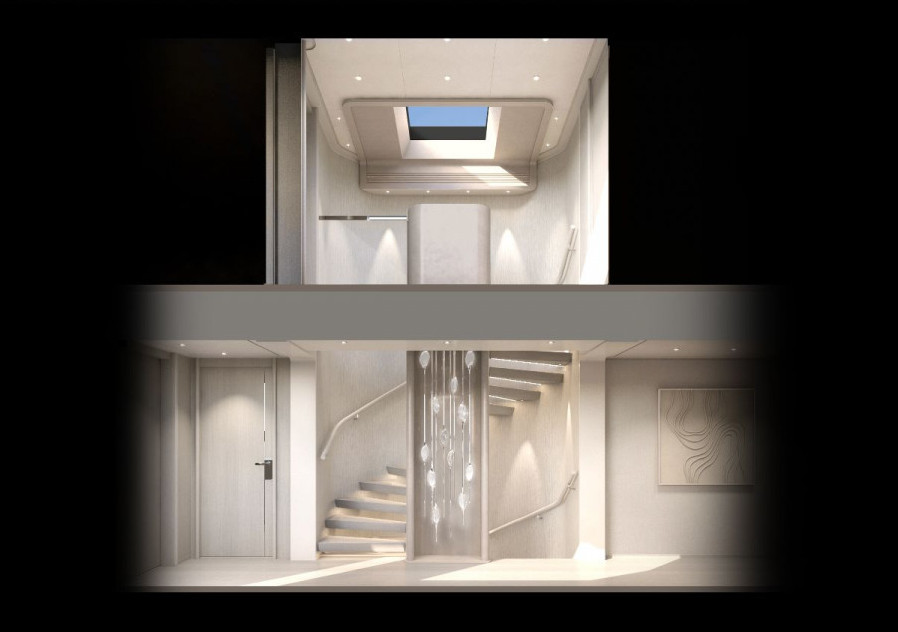 The yacht’s sharp, modern lines and low bulwarks enhance the view, integrating the environment into the profile. Full-height windows and the absence of fashion plates maximize natural light, enhancing the connection between the interiors and the outdoors. The layout is designed for both guest comfort and crew efficiency, featuring separate crew routing for discreet service and ample hidden storage for tenders and toys on the main deck forward.