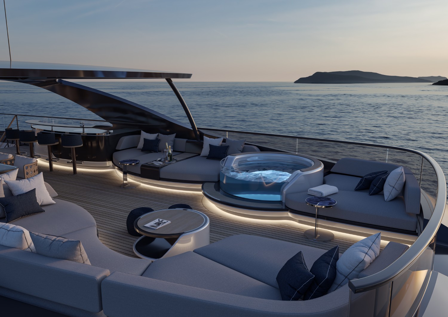 The stern is developed across three descending levels towards the sea, forming an area dedicated to relaxation and socializing, with sunbathing areas, a pool, and an elegant infinity cockpit enhanced by a glass balustrade that ensures uninterrupted panoramic views.