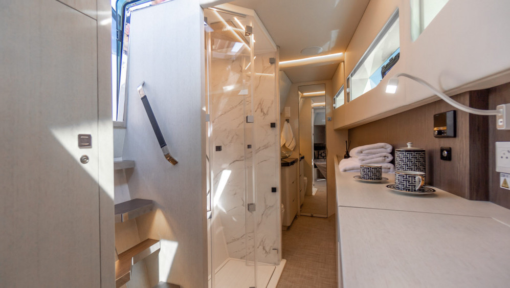 From this trial balloon to Dracan Marine was a short but crucial step. With the Dracan 42, he demonstrated how to create a beautiful catamaran (aesthetics are subjective, but proportions are not) that is balanced, spacious, and capable of introducing innovative solutions below deck, particularly in the sleeping quarters housed within the two hulls.