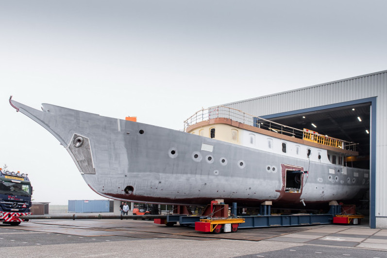 In January 2021, this laurelled, historic Little Ship of Dunkirk arrived as deck cargo from the US and entered the shipyard for repairs and interior modifications. In November 2023, she sailed away from Huisfit after a full rebuild with 40 per cent of her hull, deck and frames replaced, her interior fully reimagined and every onboard system except her original Gardner diesels fully overhauled or replaced.