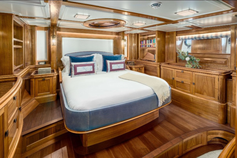 The designers sought to minimize the impact of the hull curve in the owner’s stateroom lowering the bed and rethinking storage.