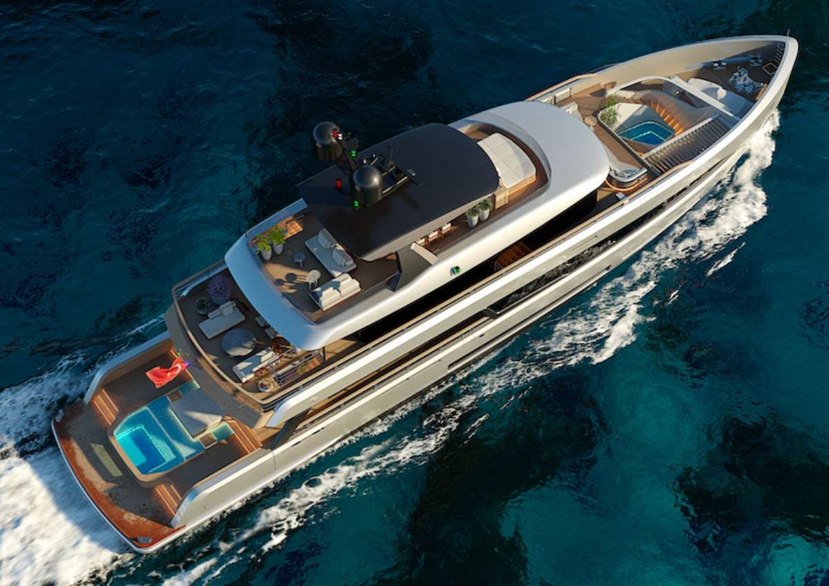 Meanwhile, the Sirena 118 marks the debut of a new, larger composite line, with a waterline length exceeding 24 meters and a gross tonnage below 300GT. This 36-meter superyacht showcases exterior lines designed by Sirena’s in-house team, interiors by Cor D. Rover, and naval architecture by German Frers. Its three decks of accommodation are crowned by a spacious sun deck, which offers an optional circular pool and lounging area at the bow, along with a vast beach club at the stern.