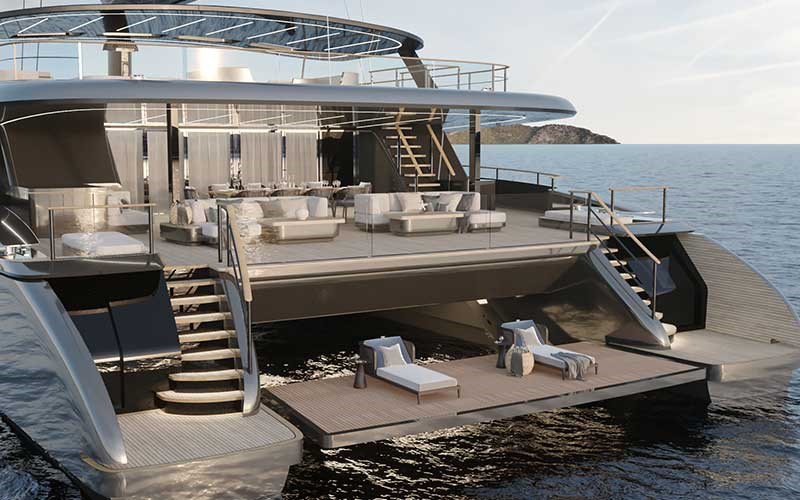 The aft of the Sunreef 43M Eco welcomes guests to a vast Ocean Lounge – a walkaround beach club merging the aft platform, skirts and two fold-down balconies into one large relaxation space.