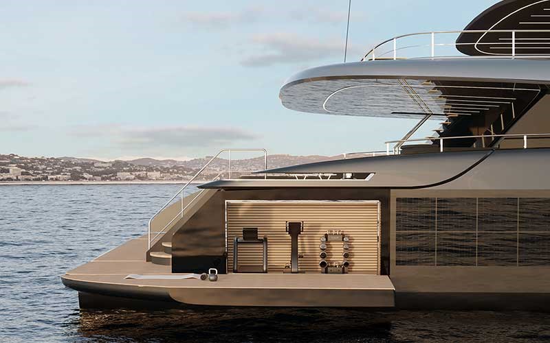 The fully customizable area can accommodate a massage room with ocean views, a bar for serving drinks between watersports activities or a fitness area. The yacht’s invisible aft garage conceals two large personal watercrafts, electric water toys and an inflatable catamaran.